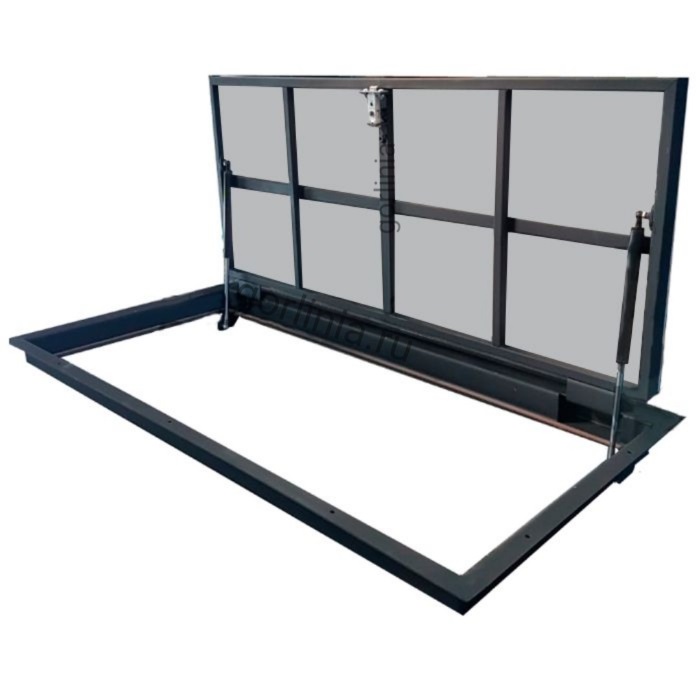 Облегченная коробка из профилированного листового проката 3 мм с наличником - есть ограничения по монтажу, свяжитесь с нами! Каркас дверки с обвязкой сварен из трубы 30х20, заполнен ГВЛ под чистовую отделку. Конструкция смещенного за ось шарнирного соединения сохраняет лаза в чистоте 1150х600 для удобства спуска по лестнице в подвал.