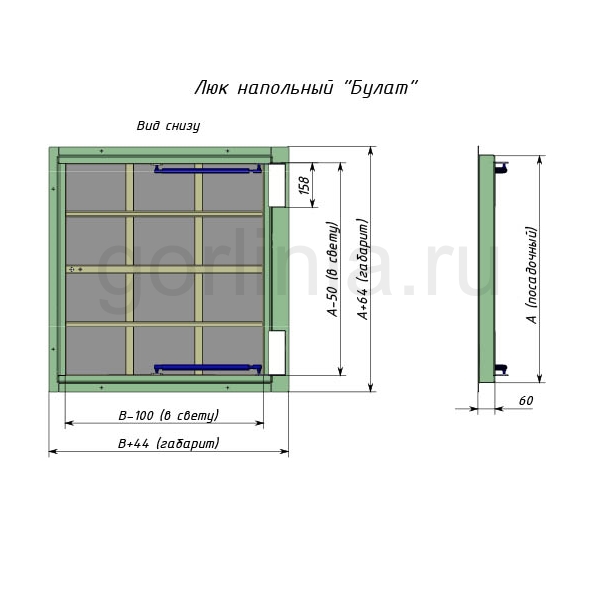 Облегченная модель в заказном размере без щелей в полу с уведенными за ось открывания петлями по длине 700. Легкая ходовая часть и удобная установка. При формировании конфигурации напольного отверстия обратите внимание, что защитные кожухи шарниров выходят за посадочную отметку по плечевой стороне 600.