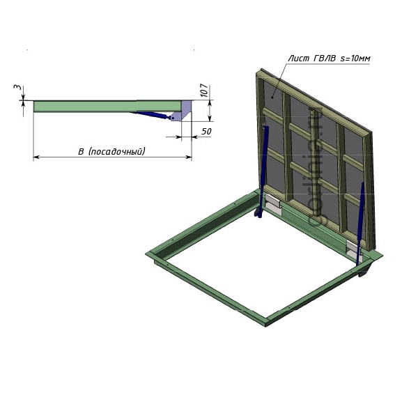 Облегченная модель прямоугольного размера без щелей в полу со смещенными за ось открывания петлями через вырезанные в раме ниши. Легкая ходовая часть на амортизаторах и удобный монтаж с облицовкой крышки керамическим или ламинированным покрытием.
